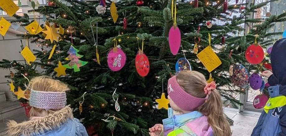 Kinder schmücken den Weihnachtsbaum im Rathaus