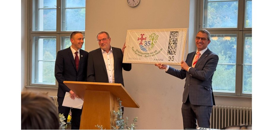 Und noch ein weiterer Anlass wurde im Rahmen eines stimmungsvollen Festakts im Kurmittelhaus begangen: die 35jährige Partnerschaft zwischen unseren Städten. Als Gastgeschenk und verbindendes Symbol überreichte Bürgermeister Klaus Blome dem stellvertretenden Bürgermeister Jenssen eine eigens kreierte Briefmarke.