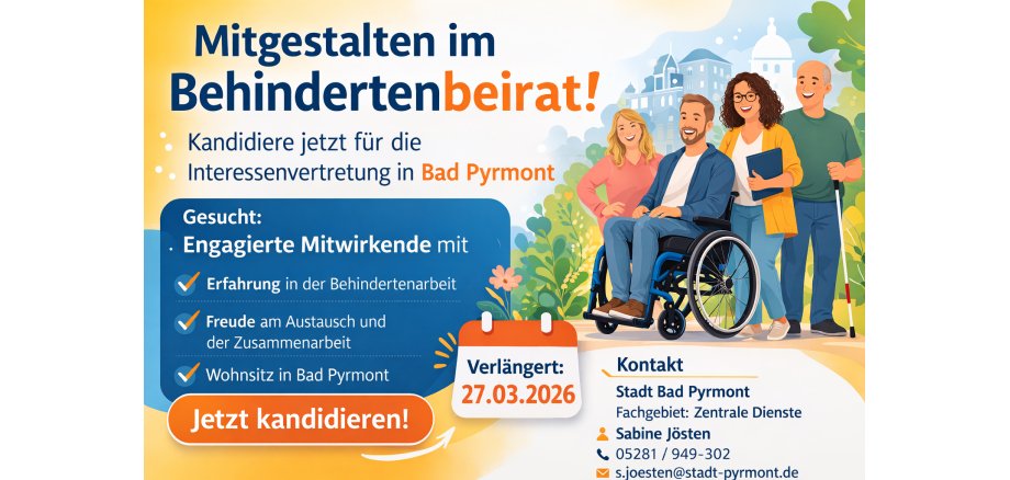 Nun ist der Beirat neu zu besetzen. Daher rufen die Stadt Bad Pyrmont und der Beirat alle Bürgerinnen und Bürger der Stadt Bad Pyrmont, die sich für die Belange behinderter Menschen in unserer Stadt einsetzen möchten, auf, sich als Kandidaten zur Verfügung zu stellen, um aktiv mit zu gestalten.