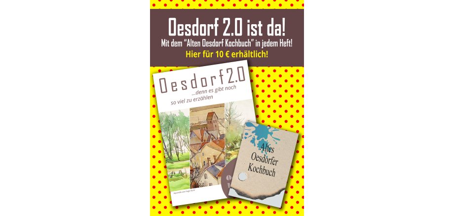 Jetzt ist Oesdorf 2.0 da mit dem Untertitel „..denn es gibt noch so viel zu erzählen“. Zeitzeugen der Oesdorf AG berichten darin humorig über vergangene Erlebnisse und den Oesdorfer Künstlern wurde ein breiter Raum gewidmet. Der Clou ist aber ein kleines Oesdorfer Kochbuch, das in jedem Heft klebt. 12 tolle Seiten mit Rezepten direkt aus alten Oesdorfer Kochbüchern der 20er und 30er Jahre. Kommen Sie am 14.03.2026 auf den Wochenmarkt und sichern Sie sich ein Exemplar für 10 Euro (inkl. Kochbuch).