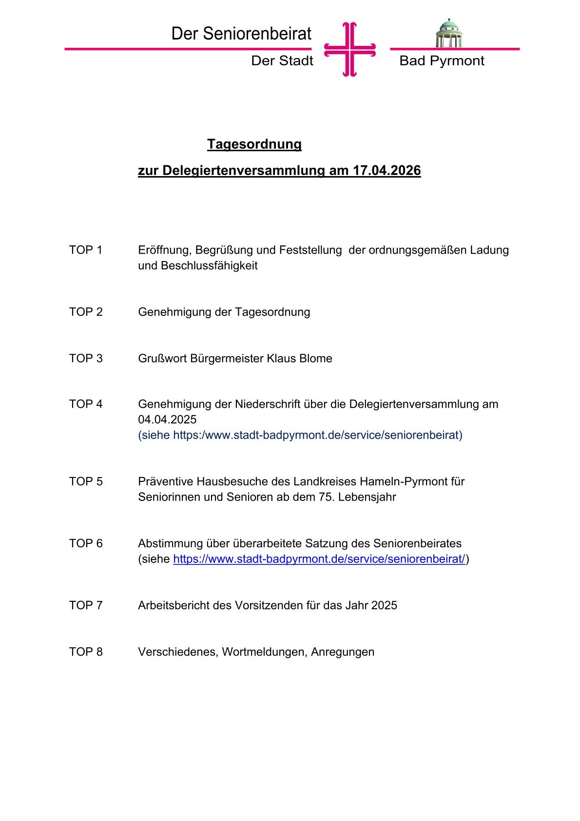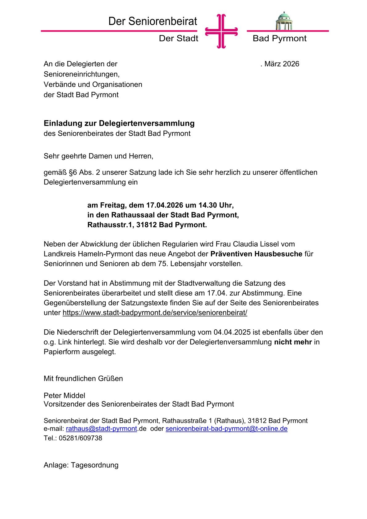 Der Seniorenbeirat der Stadt Bad Pyrmont organisiert einen Busausflug zur Landesgartenschau Niedersachsen nach Bad Nenndorf. Interessierte können sich bis zum 10.Mai 2026 bei Peter Middel, Tel 05281 - 961678 oder per mail: peter.middel@t-online.de anmelden. Die Kosten betragen pro Person für Busfahrt und Eintritt in die Landesgartenschau € 35,00. Dieser Betrag ist im Vorfeld zu bezahlen. Die IBAN für eine Überweisung erhalten Sie bei Anmeldung.
