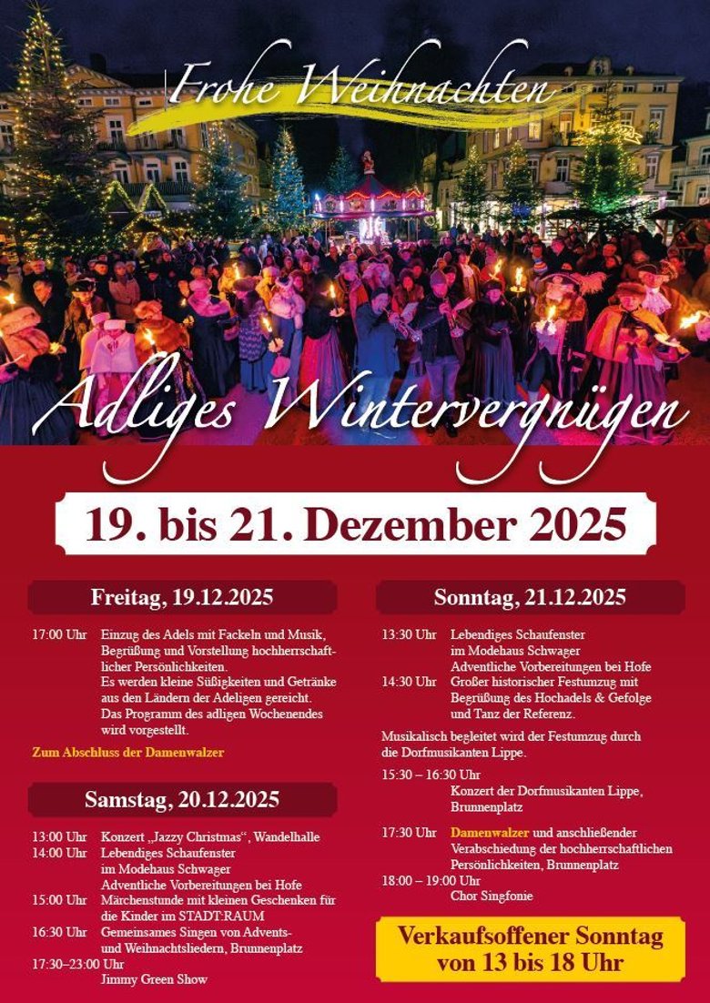 Der Weihnachtsmarkt in Bad Pyrmont öffnet am Montag, dem 24. November, erstmals um 11:00 Uhr seine Pforten und bleibt bis einschließlich Montag, dem 30. Dezember, geöffnet.